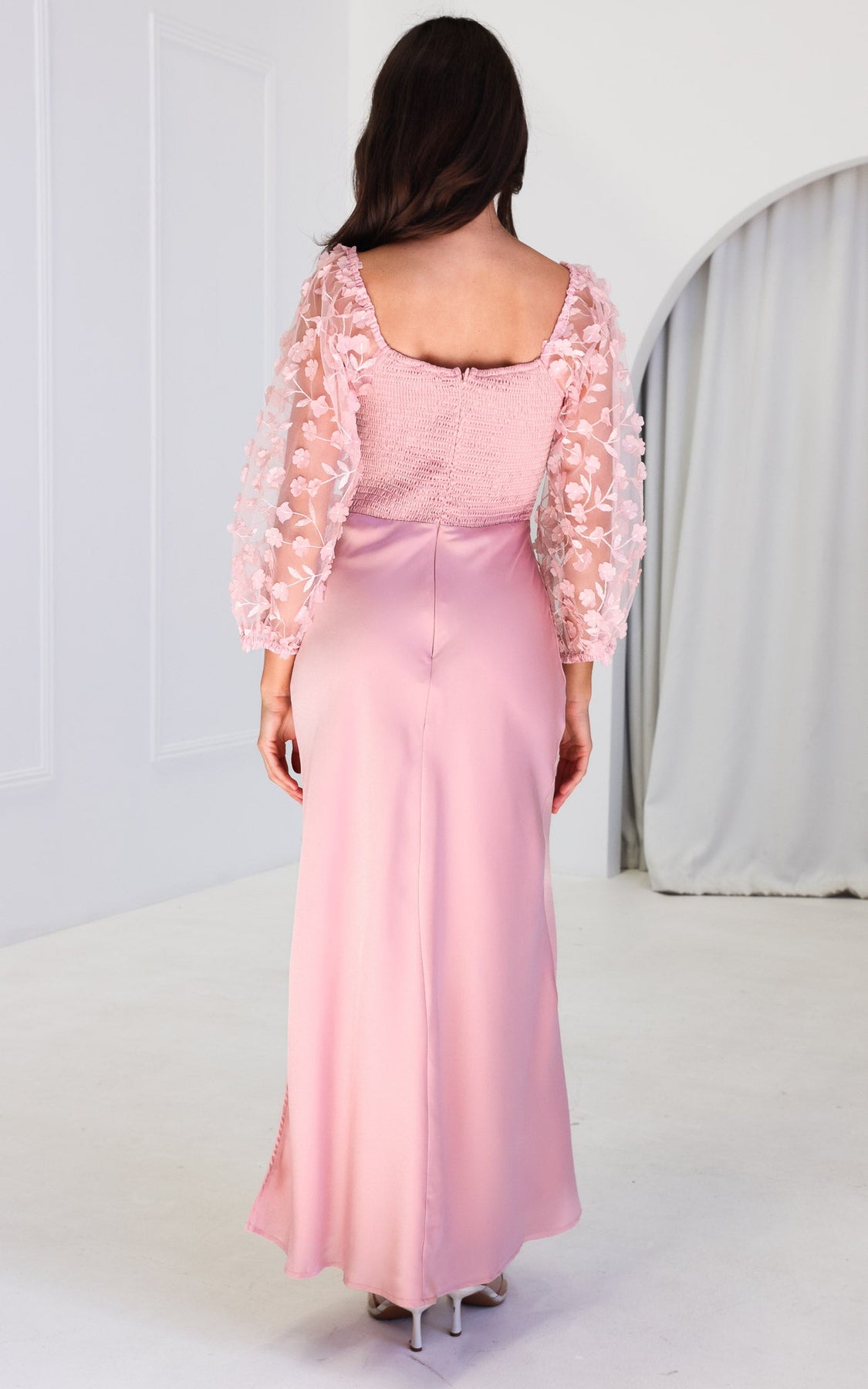 Please take care with the embroidery on this style when in contact with main satin fabrication, it can cause the main satin to wear. When stored please hang and ensure sleeves have minimal contact with satin fabric.