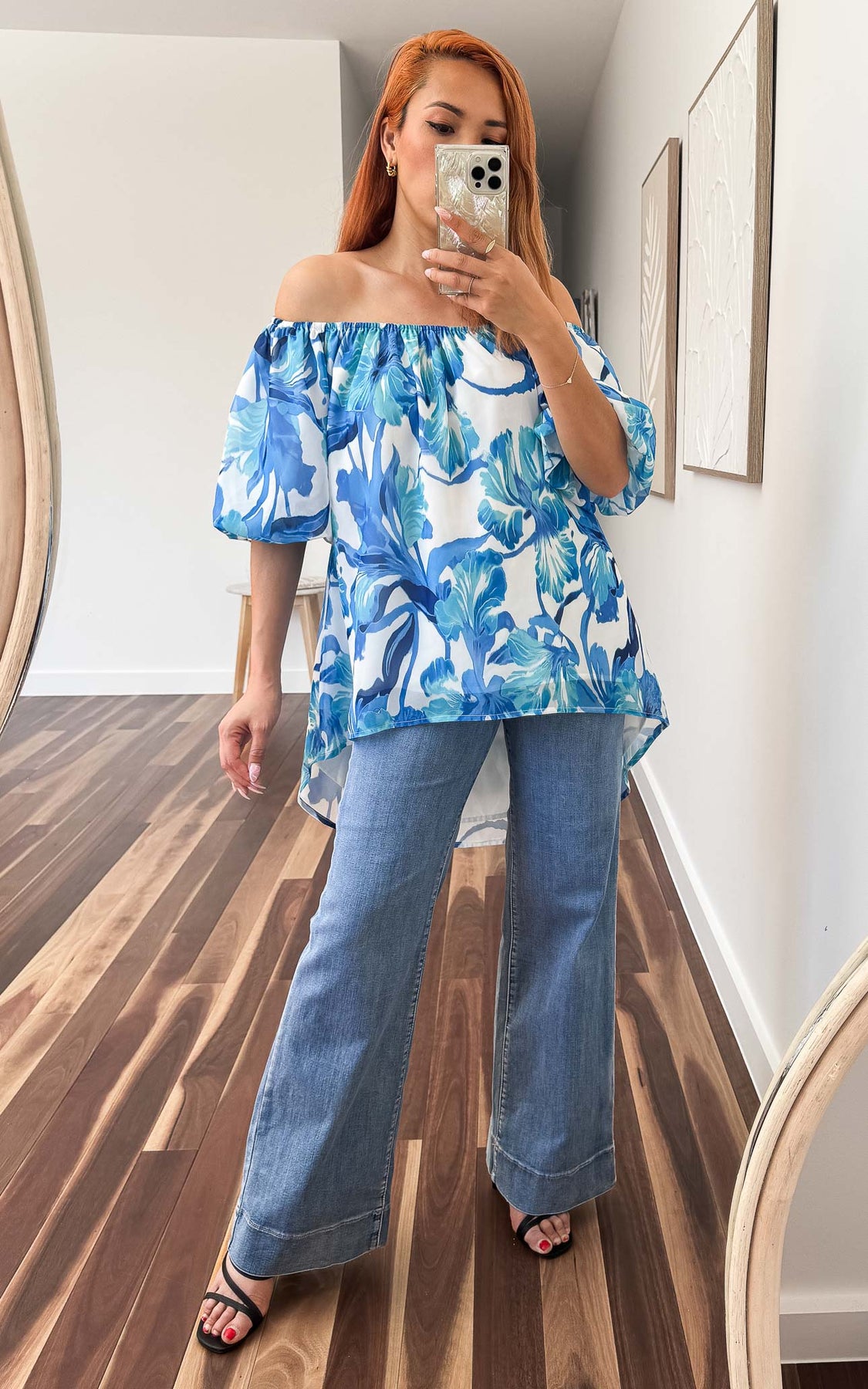 – Colour: white base with blue floral print (print placement may vary with each piece)