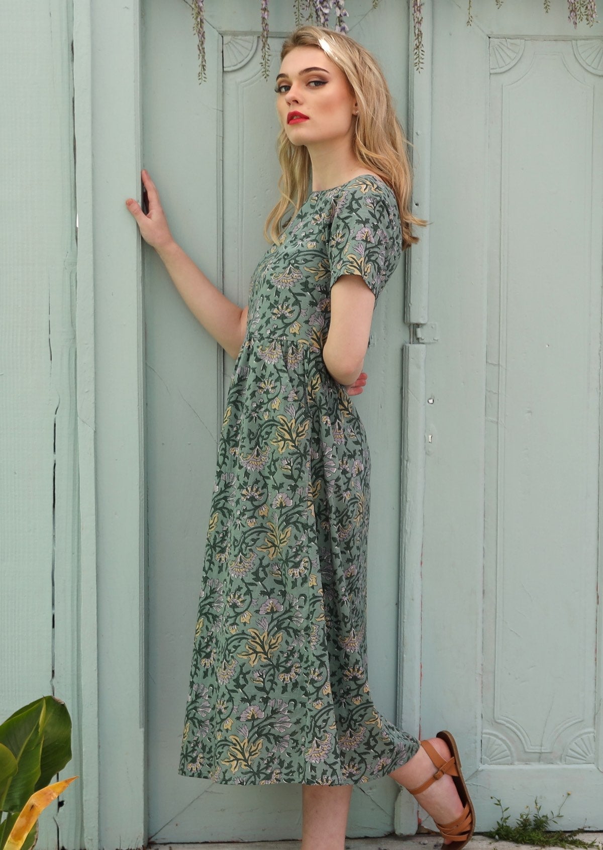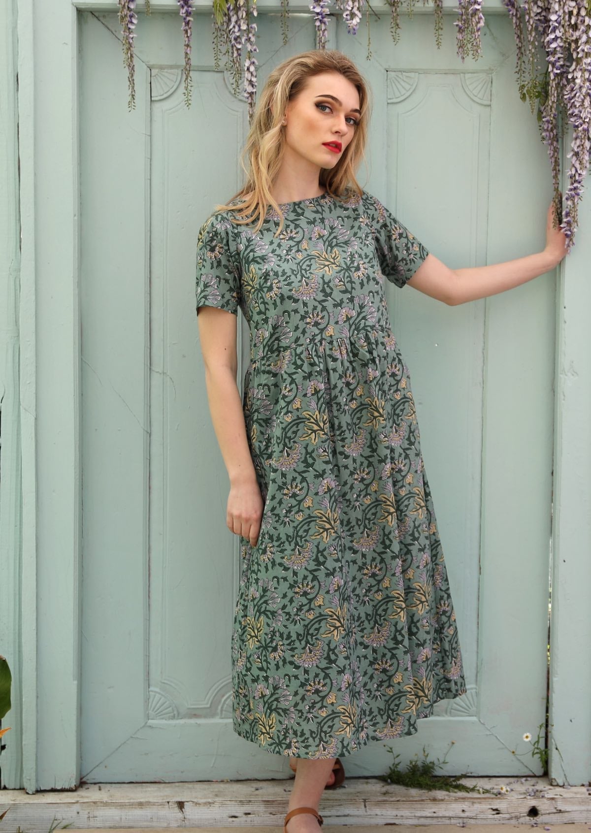 Crafted from comfortable 100% cotton, the August Dress offers a relaxed fit in a versatile midi length dress, in a beautiful grey Indian floral print on a soft sage green base. This modest cotton dress features a boat neckline, T-shirt sleeves and pockets, has a keyhole button back closure at the nape of the neck, for ease when dressing, and is fully lined. This dress is a perfect everyday dress, and looks great with a jacket or cardi, or try adding a waist belt to enhance your waistline.