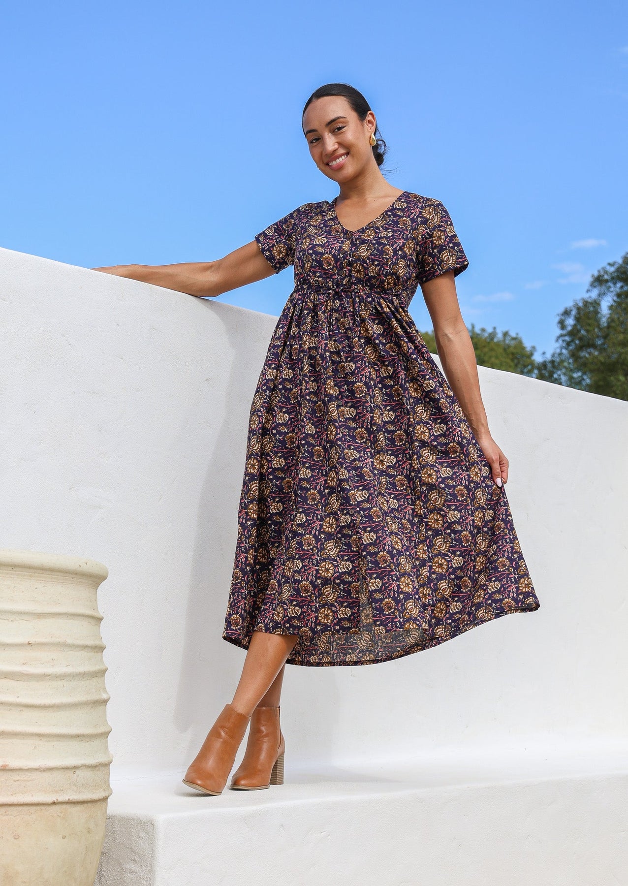 Our popular pure cotton Promenade Dress now comes in the beautiful Raani print, featuring pink florals on a deep purple base. This relaxed fit, 100% cotton dress is perfect for adding a touch of colour and ease to your wardrobe. This dress features short sleeves, an empire waistline, and hidden side pockets for functionality. Buttoning through to the knee, complete with a V-neck and delicate cord accents. Use the shoestring side ties to gather the waist and create a flattering silhouette. This dress is the ultimate blend of style and comfort for your spring and summer wardrobe. Pair with wedges for a chic daytime look, or add leggings, boots, and a Corduroy Jacket for cooler days.