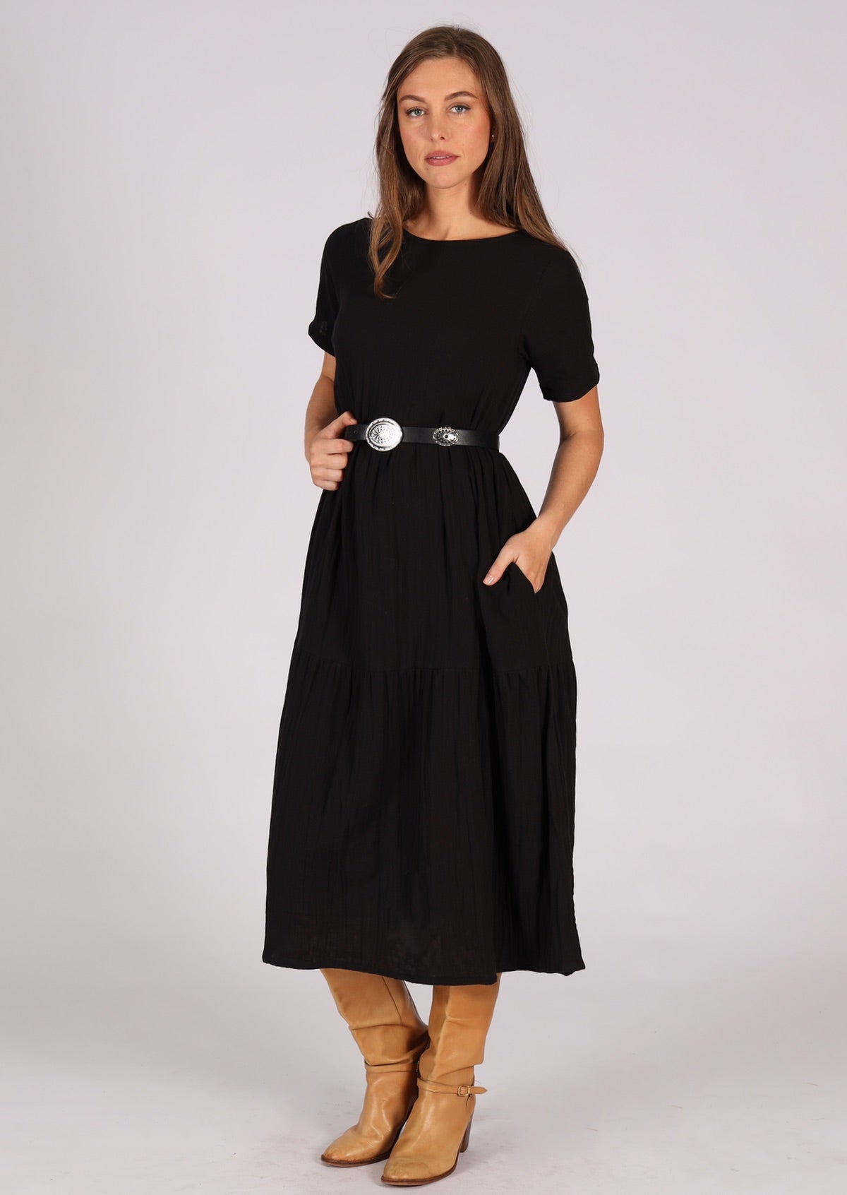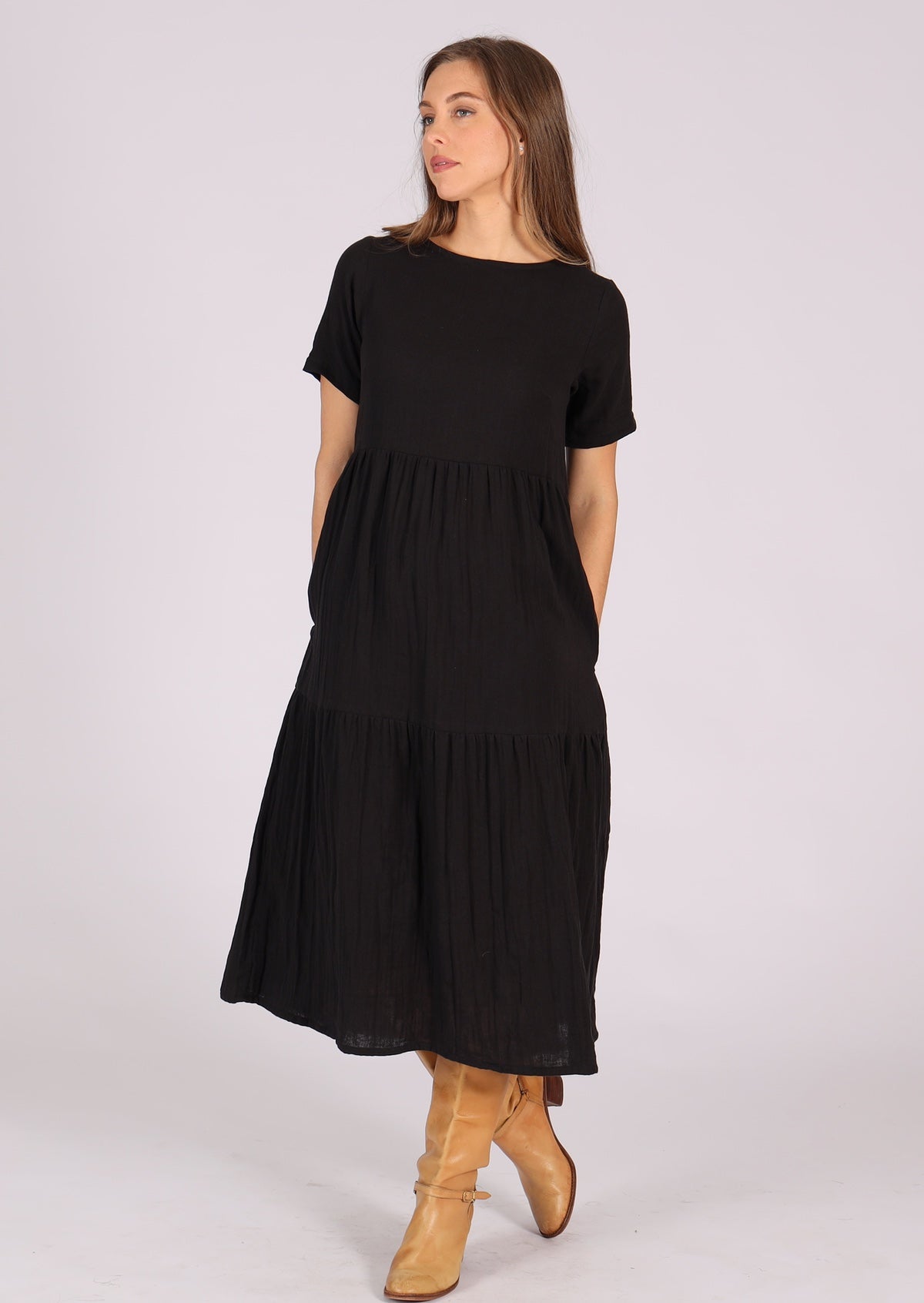 Our popular Claudia dress is now made in double cotton. Featuring three breezy tiers, a high round neckline, and hidden side pockets, Claudia is sure to be a favourite. The t-shirt sleeves will protect your shoulders, and the keyhole button back closure makes it easy to dress. Simply add shoes, a necklace, and try it with a belt.