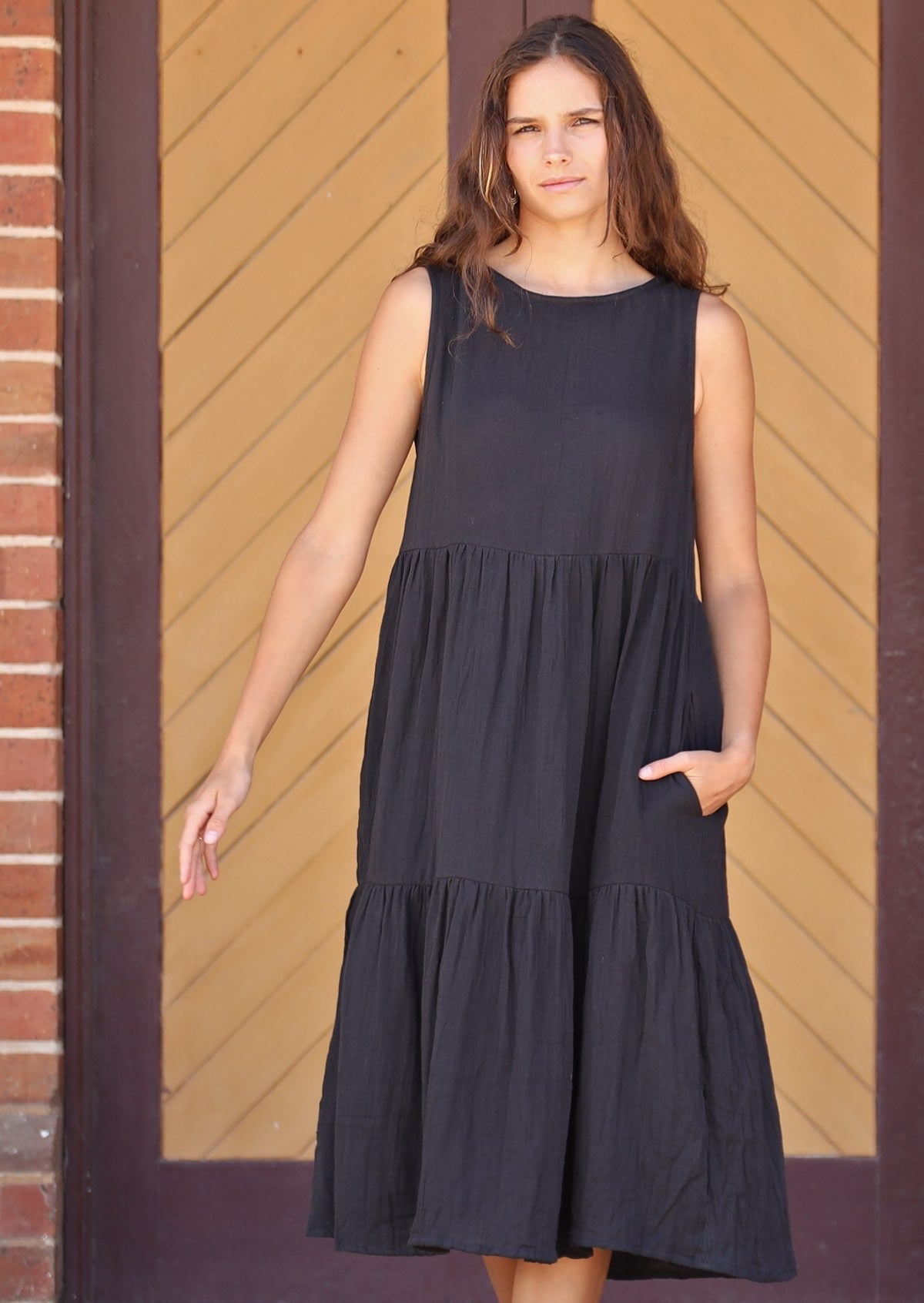 This light weight cotton, three tiered, sleeveless dress is the perfect addition to your wardrobe for the Spring and Summer seasons. Made from beautiful light weight double cotton, this dress has a lovely flowy relaxed fit. Features a round neckline, keyhole button back closure, and POCKETS! Simply worn with sandals in the warmer weather or paired with a cardi, tights and boots in the cooler seasons! Can be cinched in at the waist with a belt too.